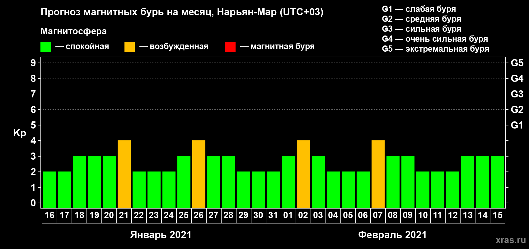 Прогноз магнитных бурь в Нарьян-Маре на 16 января 2021 года