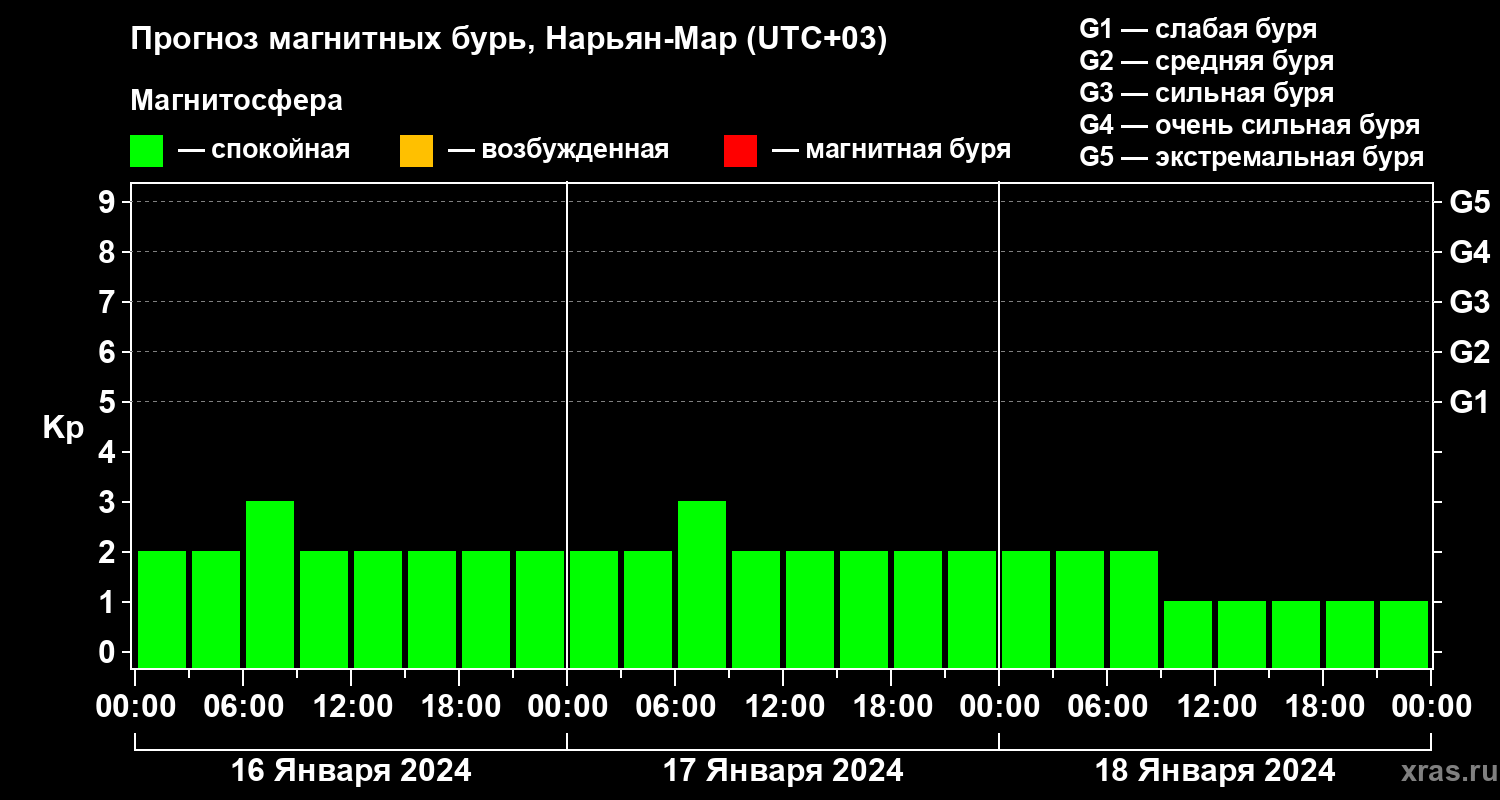 Прогноз магнитных бурь в Нарьян-Маре на 16 января 2024 года