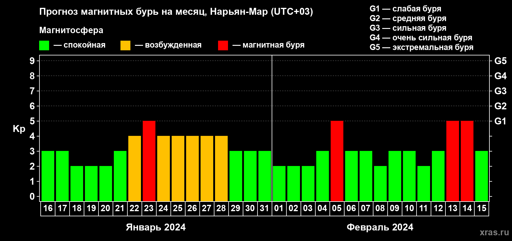 Прогноз магнитных бурь в Нарьян-Маре — 16 января 2024 года