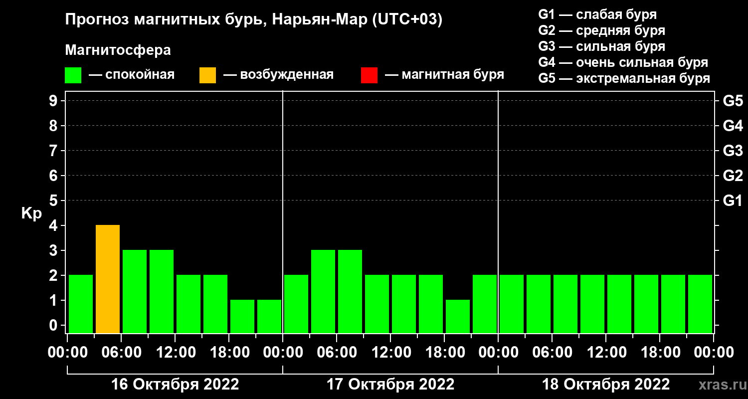 Прогноз магнитных бурь в Нарьян-Маре на 16 октября 2022 года