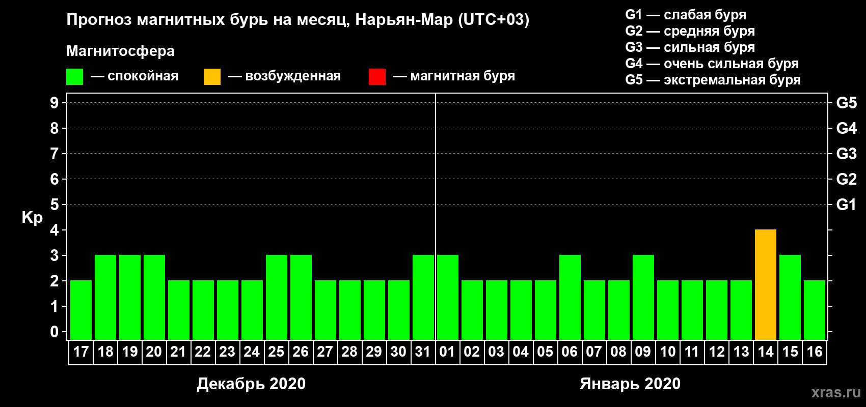 Прогноз магнитных бурь в Нарьян-Маре на 17 декабря 2019 года