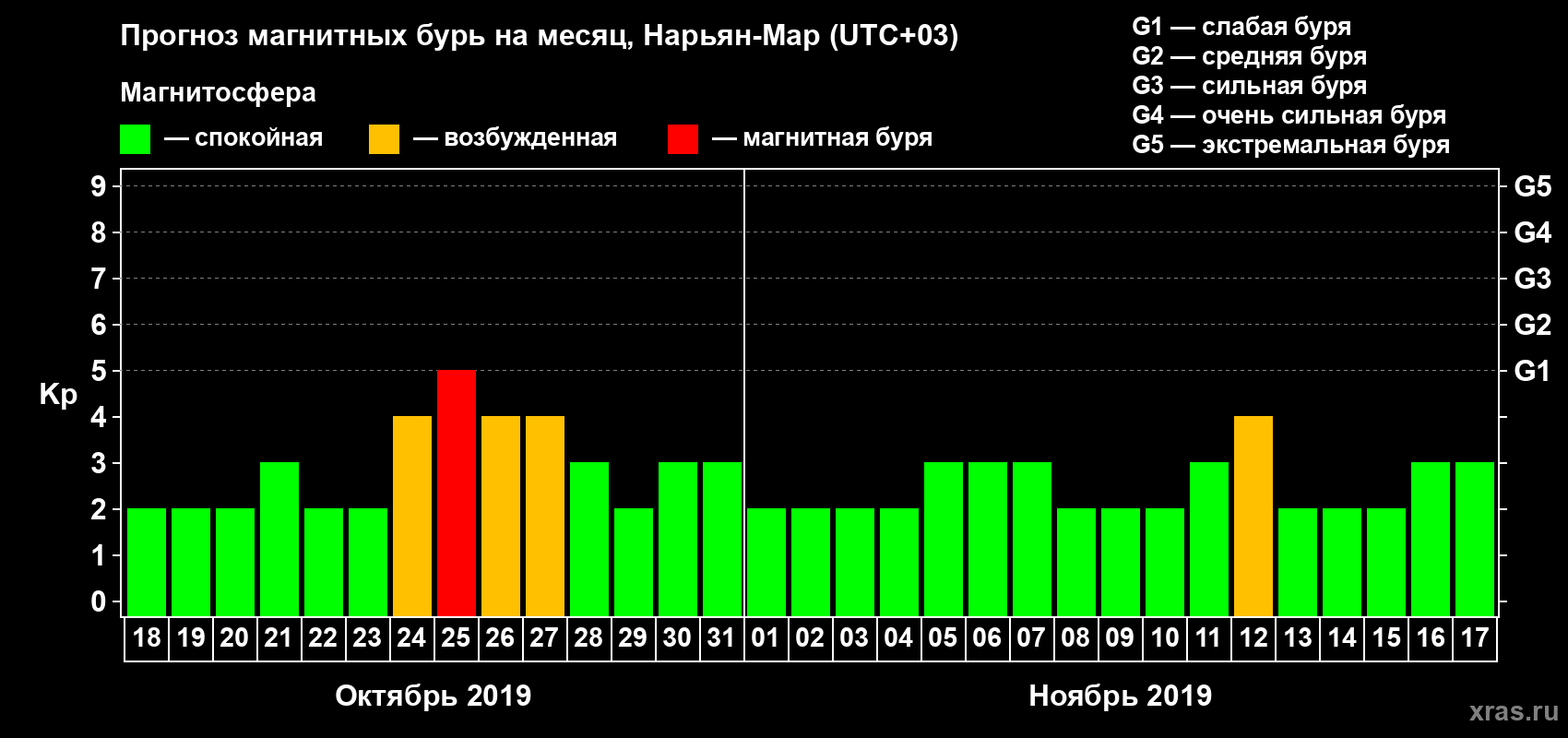 Прогноз магнитных бурь в Нарьян-Маре на 18 октября 2019 года