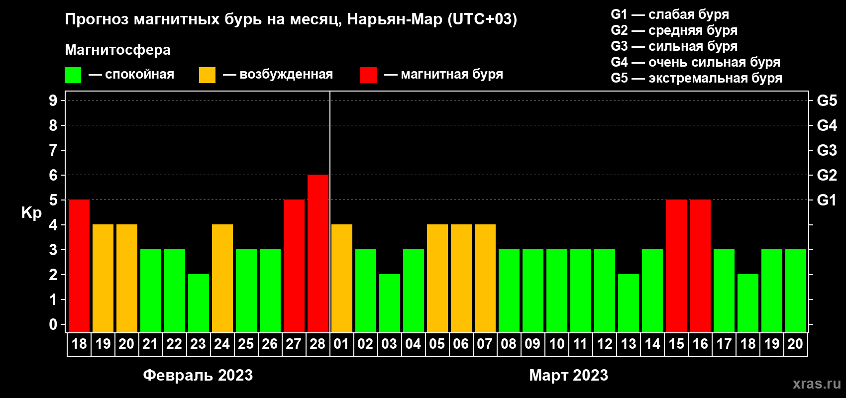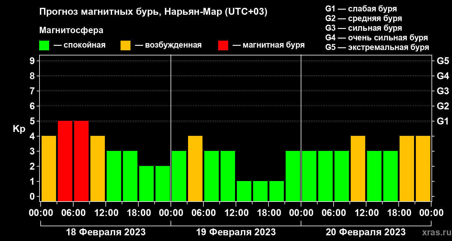 Прогноз магнитных бурь в Нарьян-Маре на 18 февраля 2023 года