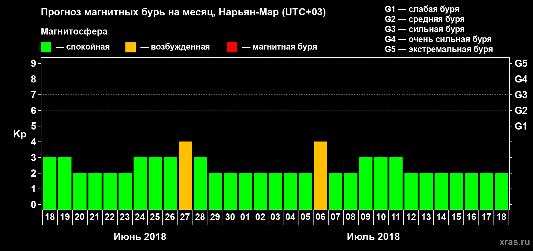 Прогноз магнитных бурь в Нарьян-Маре на 18 июня 2018 года