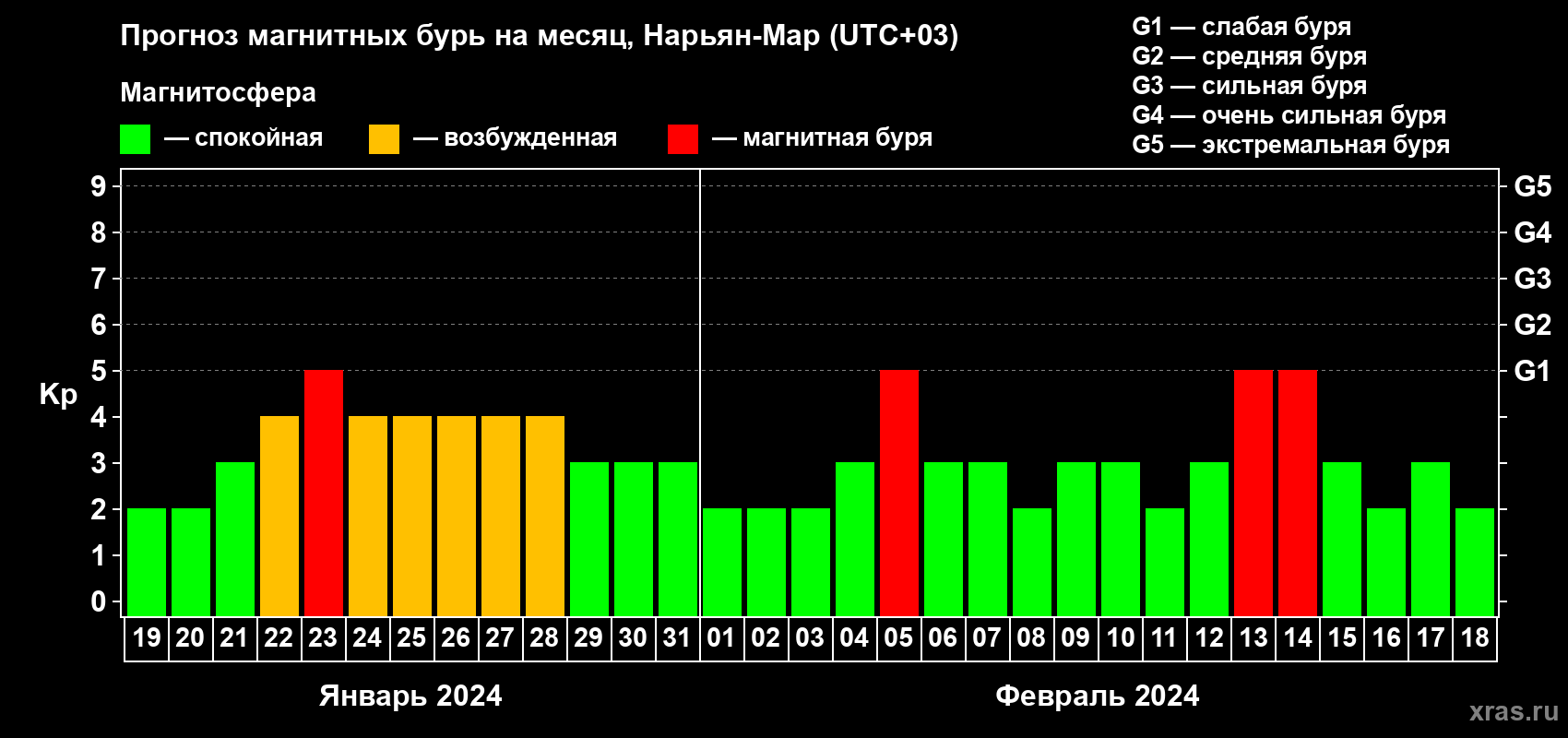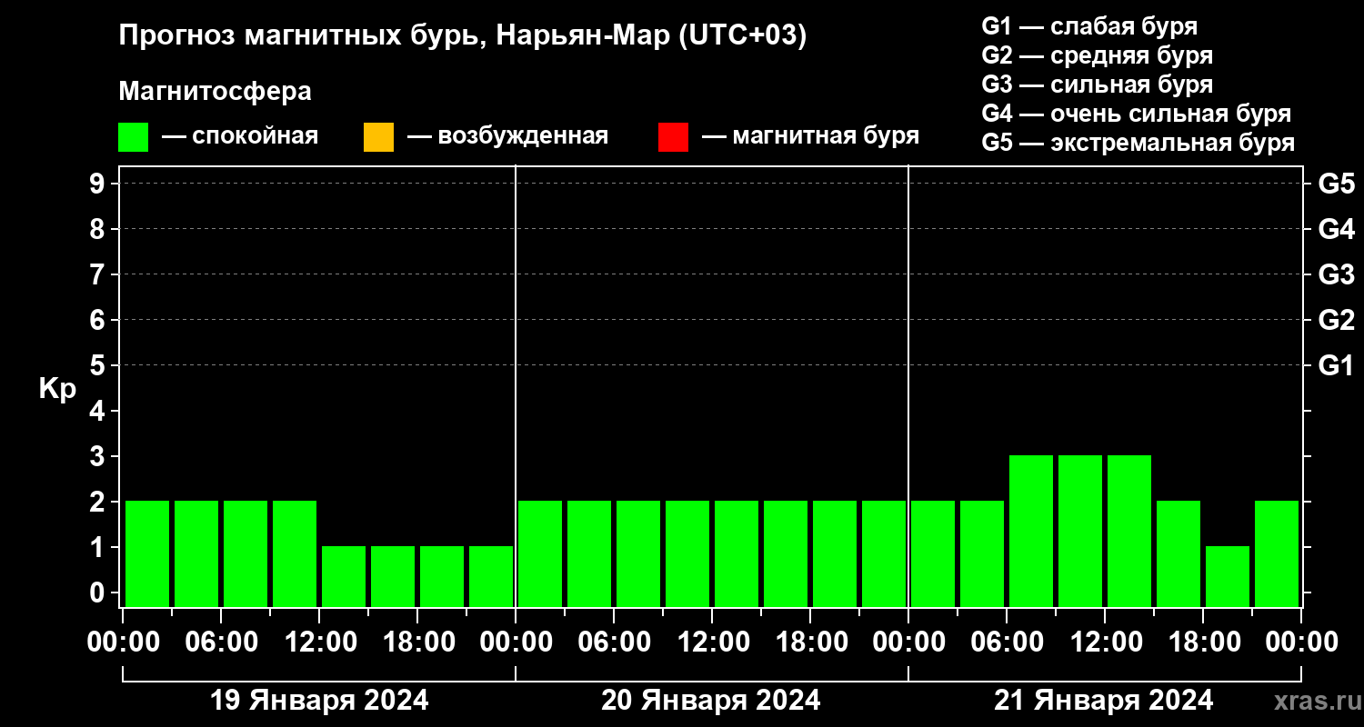 Прогноз магнитных бурь в Нарьян-Маре на 19 января 2024 года