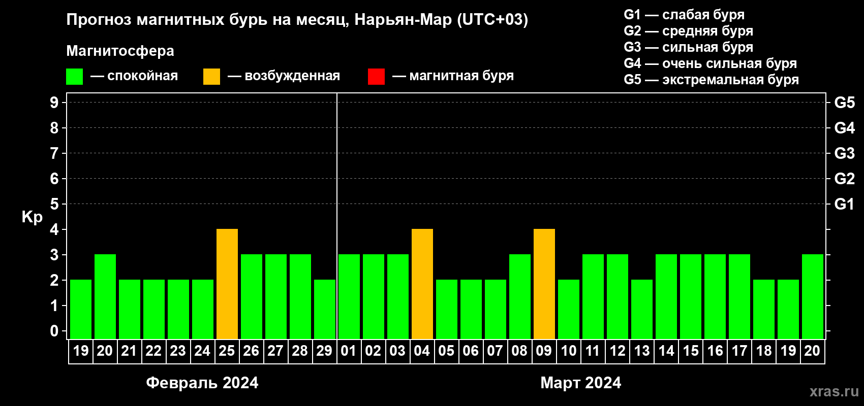 Прогноз магнитных бурь в Нарьян-Маре на 19 февраля 2024 года