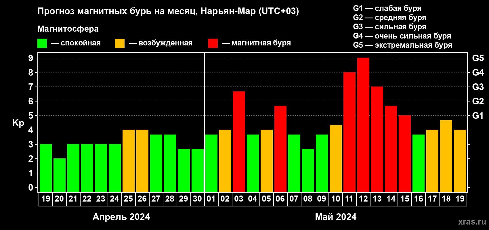 Прогноз магнитных бурь в Нарьян-Маре — 19 апреля 2024 года