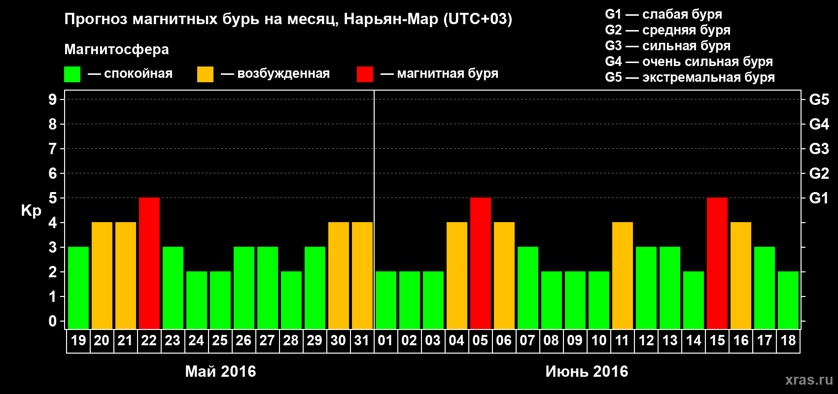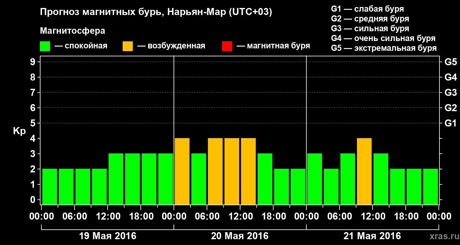 Прогноз магнитных бурь в Нарьян-Маре на 19 мая 2016 года