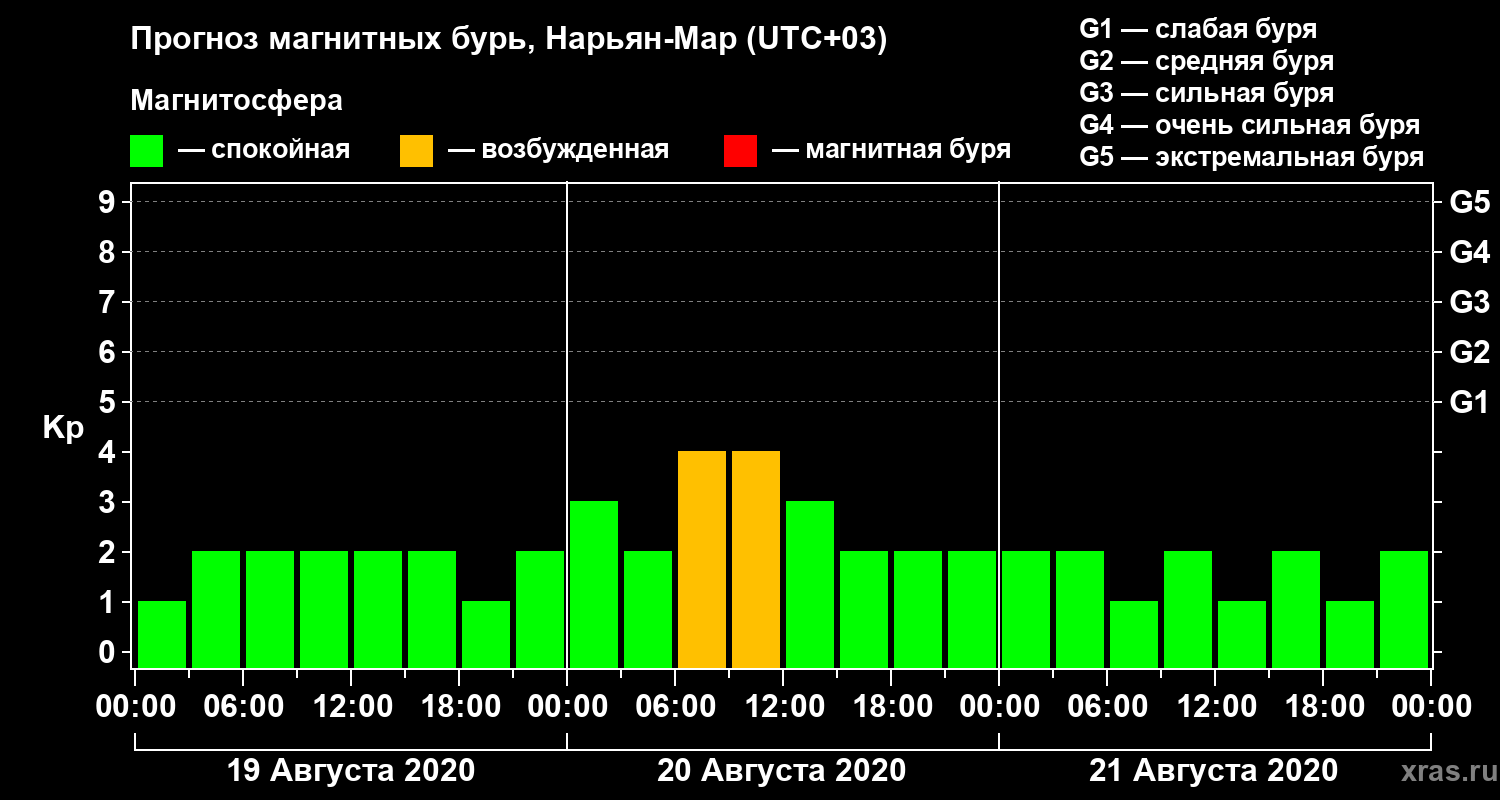 Прогноз магнитных бурь в Нарьян-Маре на 19 августа 2020 года