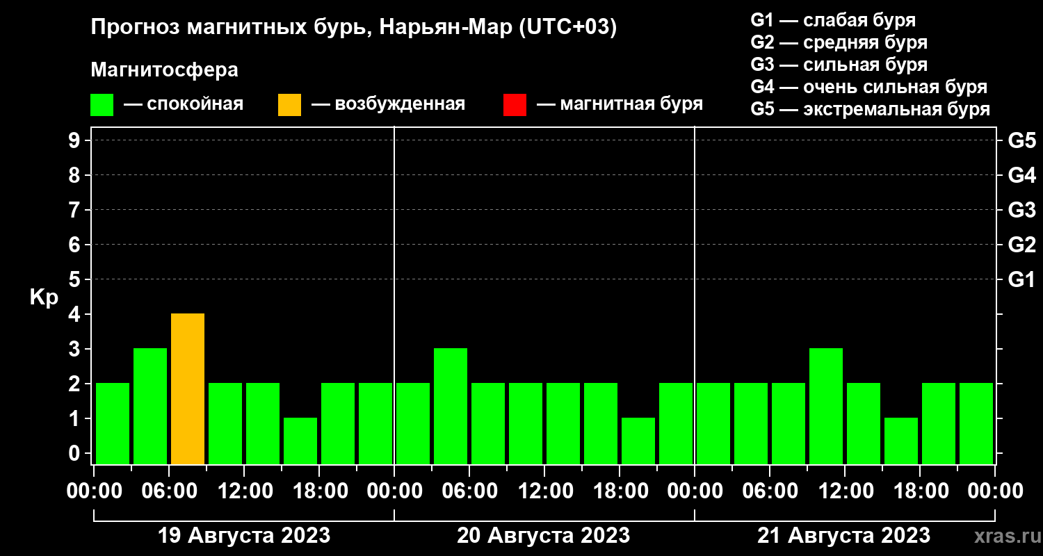 Прогноз магнитных бурь в Нарьян-Маре на 19 августа 2023 года