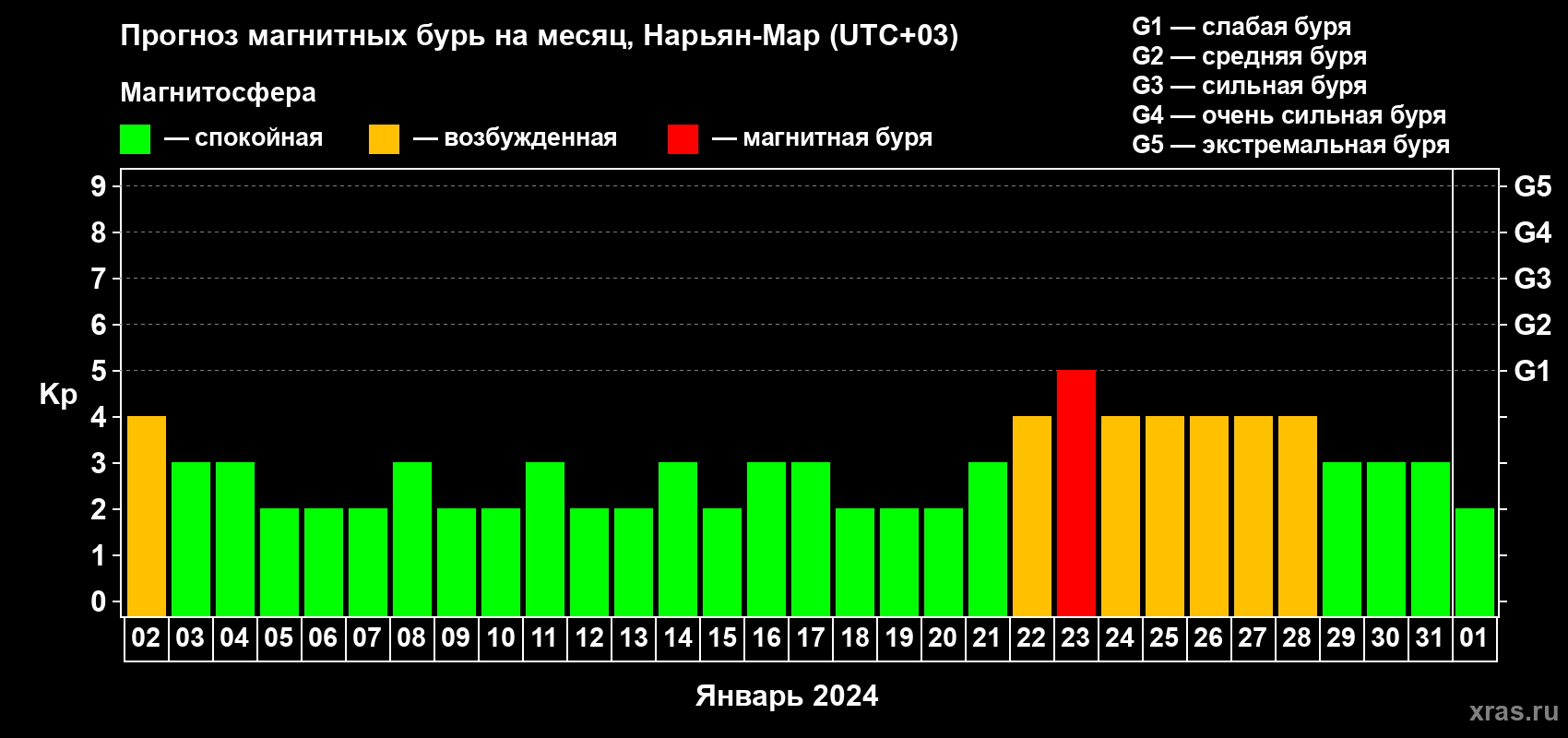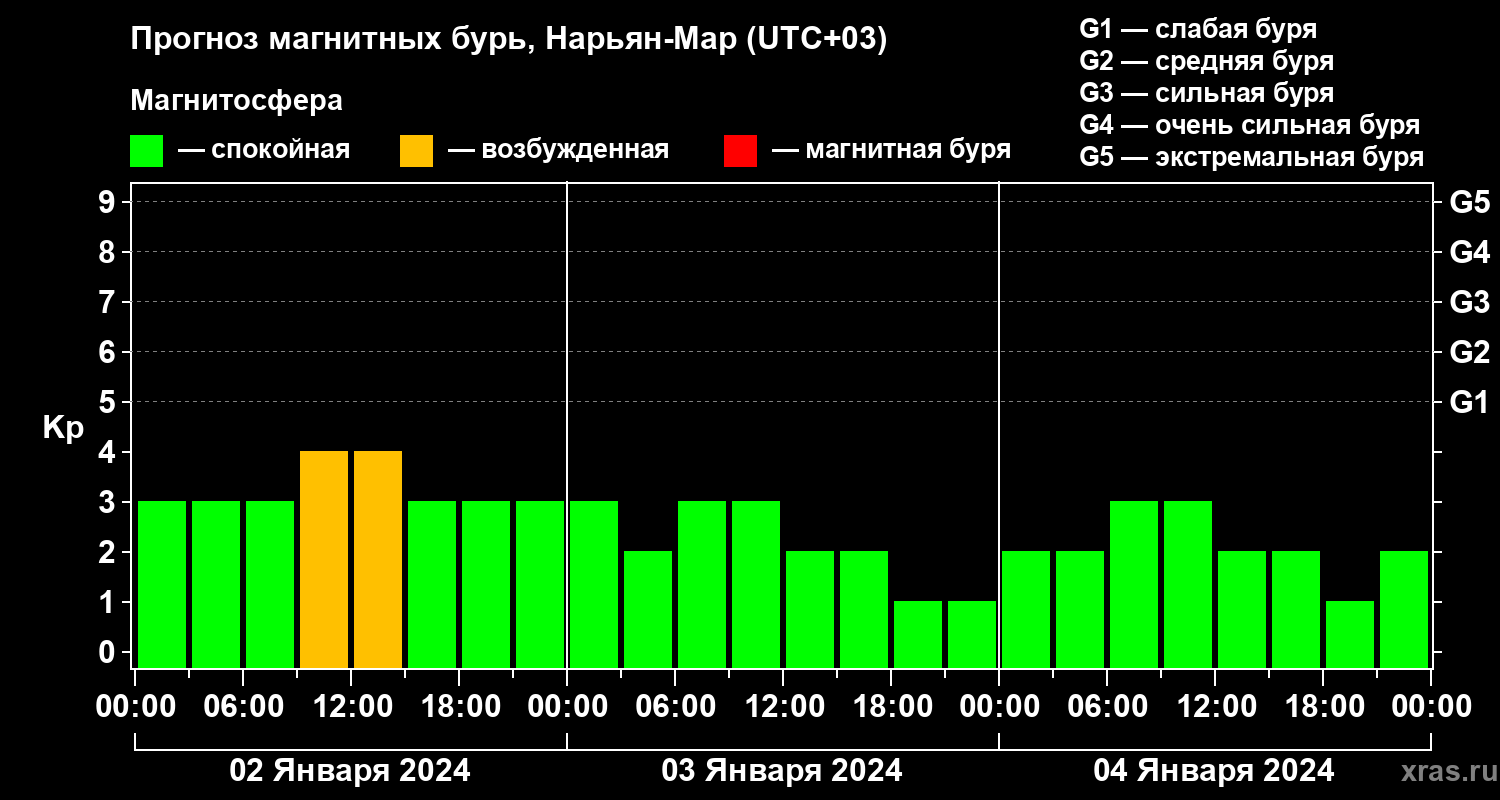 Прогноз магнитных бурь в Нарьян-Маре на 2 января 2024 года