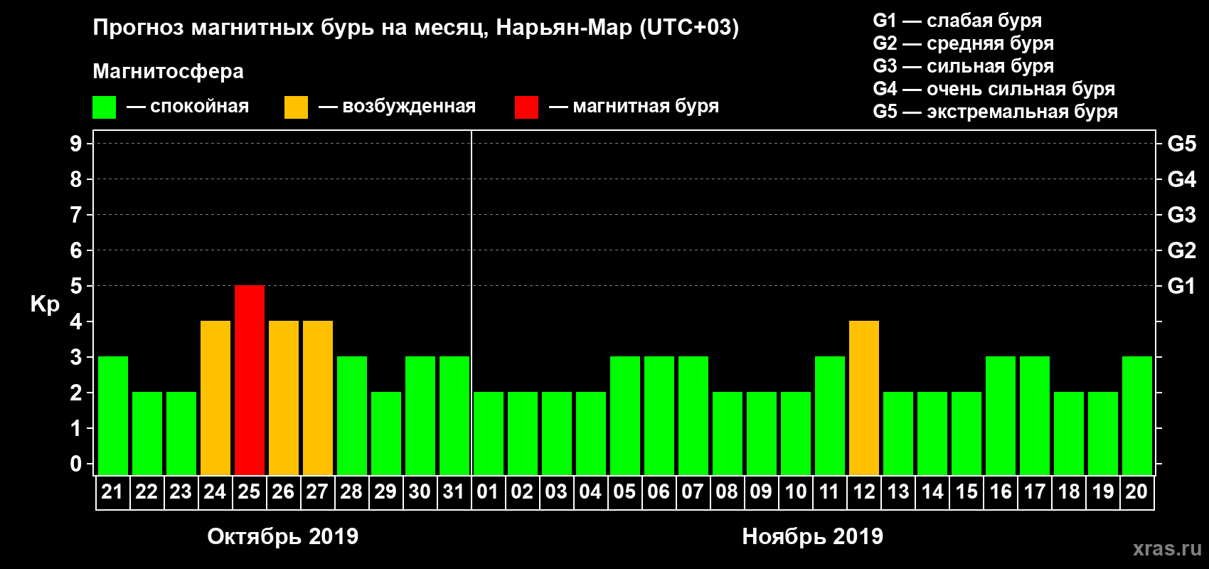 Прогноз магнитных бурь в Нарьян-Маре на 21 октября 2019 года