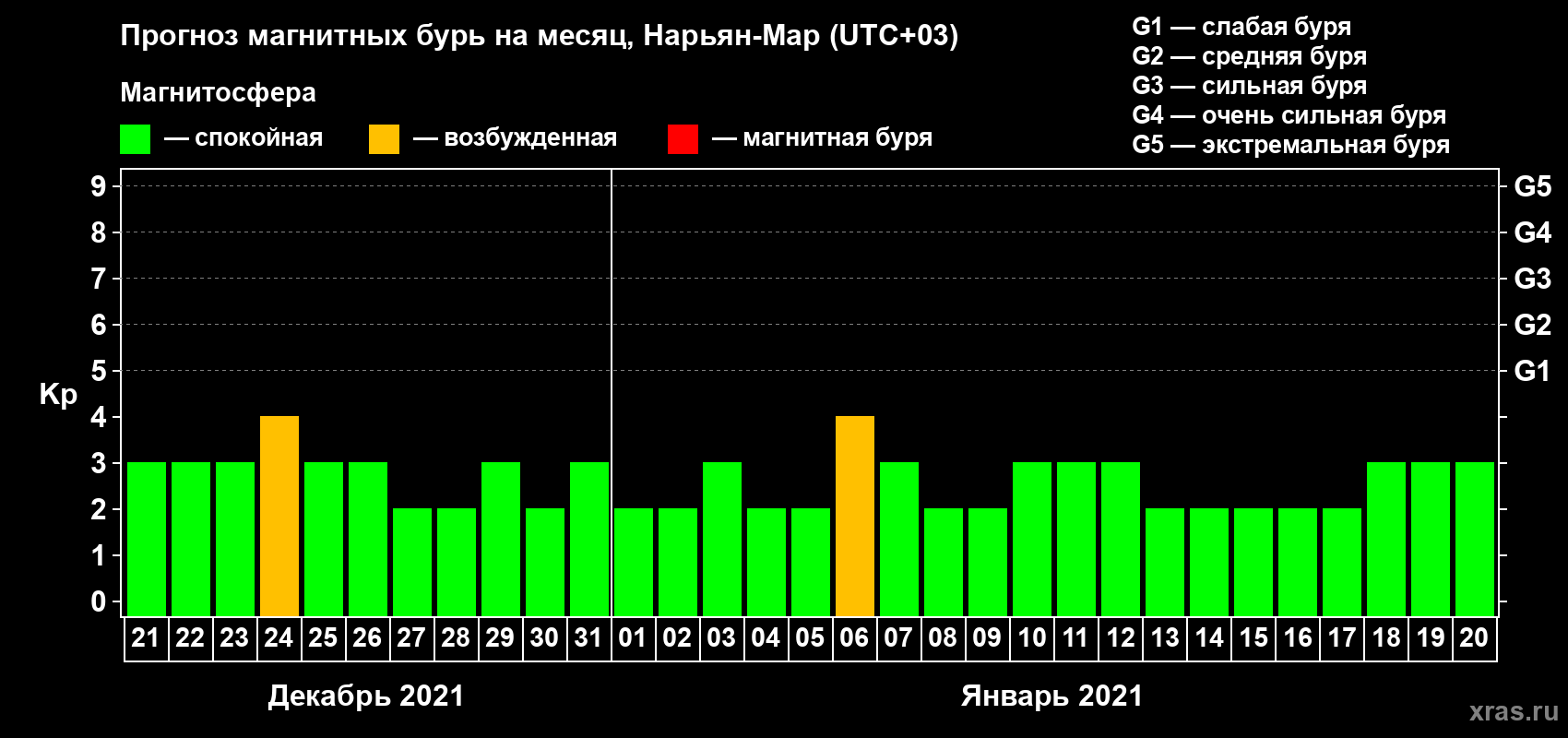 Прогноз магнитных бурь в Нарьян-Маре на 21 декабря 2020 года