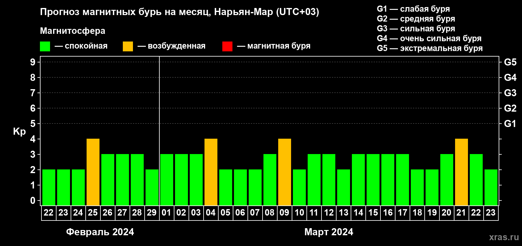 Прогноз магнитных бурь в Нарьян-Маре на 22 февраля 2024 года