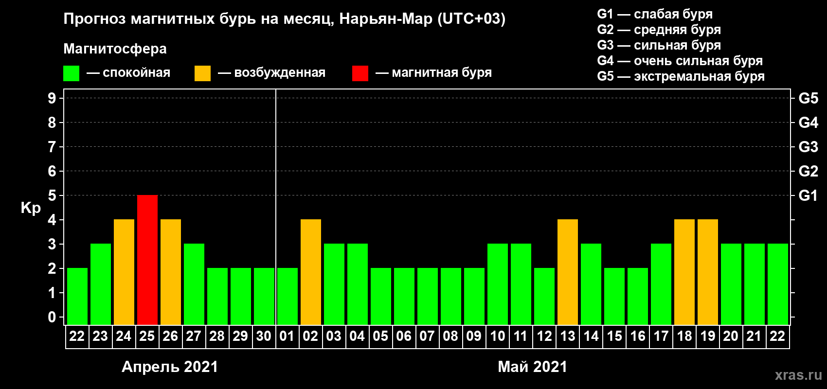 Прогноз магнитных бурь в Нарьян-Маре на 22 апреля 2021 года