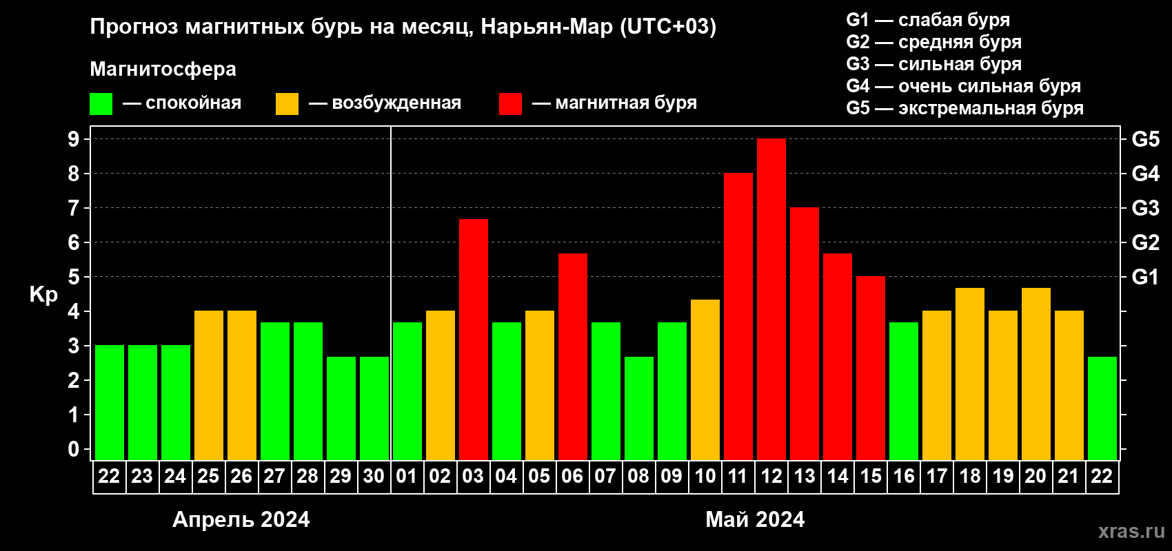 Прогноз магнитных бурь в Нарьян-Маре — 22 апреля 2024 года