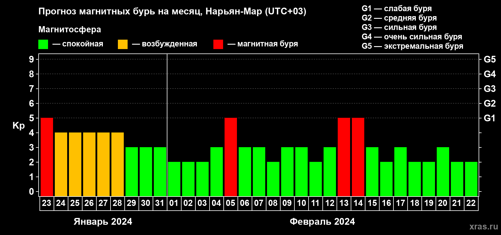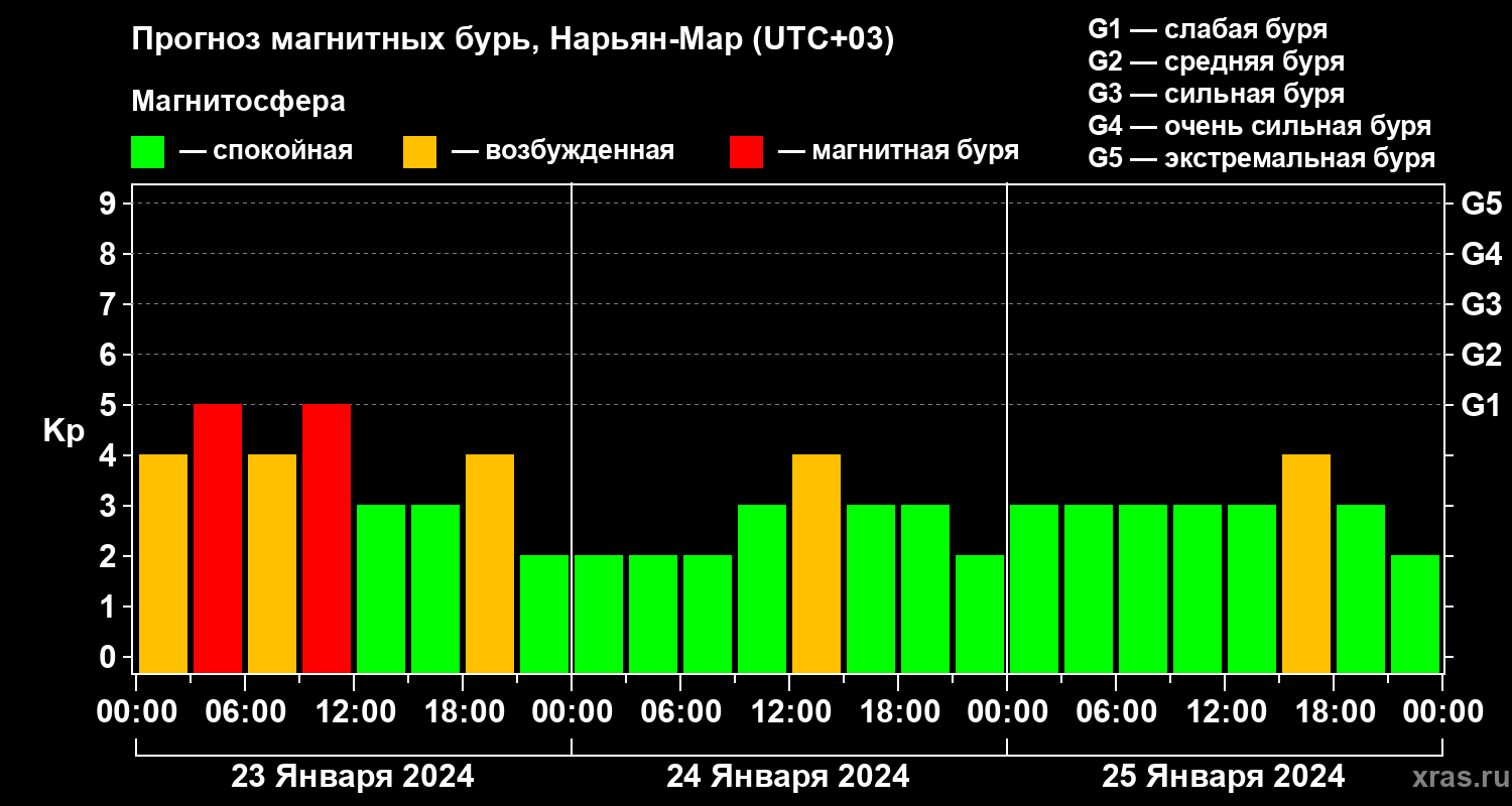 Прогноз магнитных бурь в Нарьян-Маре на 23 января 2024 года