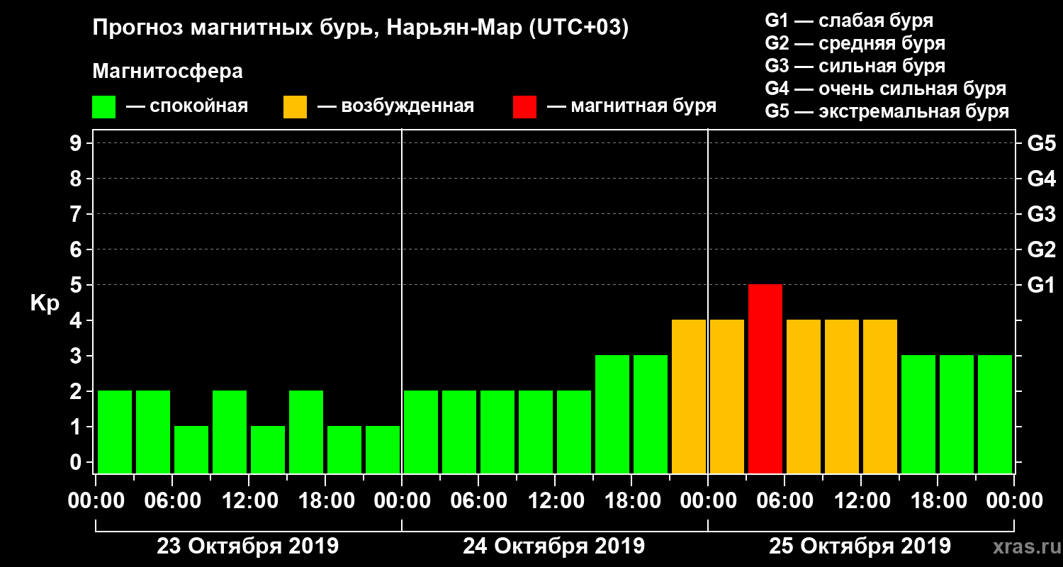 Прогноз магнитных бурь в Нарьян-Маре на 23 октября 2019 года
