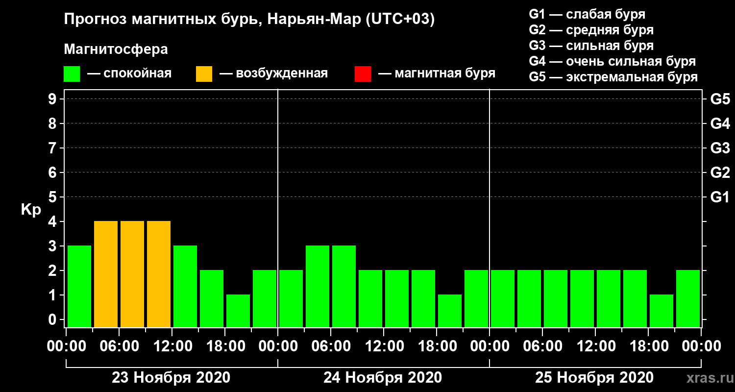 Прогноз магнитных бурь в Нарьян-Маре на 23 ноября 2020 года