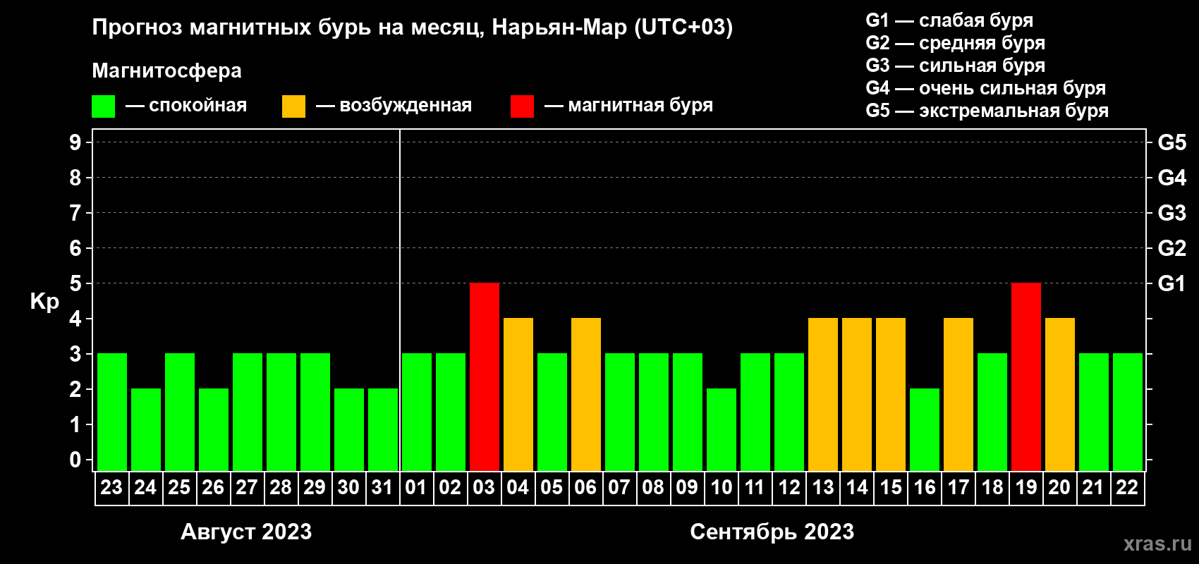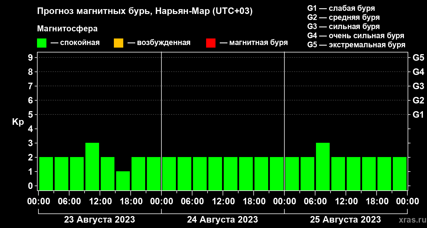 Прогноз магнитных бурь в Нарьян-Маре на 23 августа 2023 года
