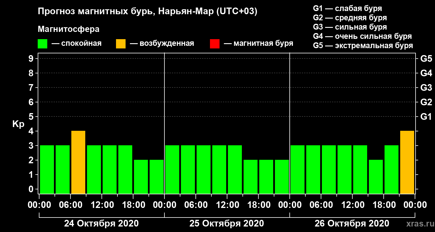 Прогноз магнитных бурь в Нарьян-Маре на 24 октября 2020 года