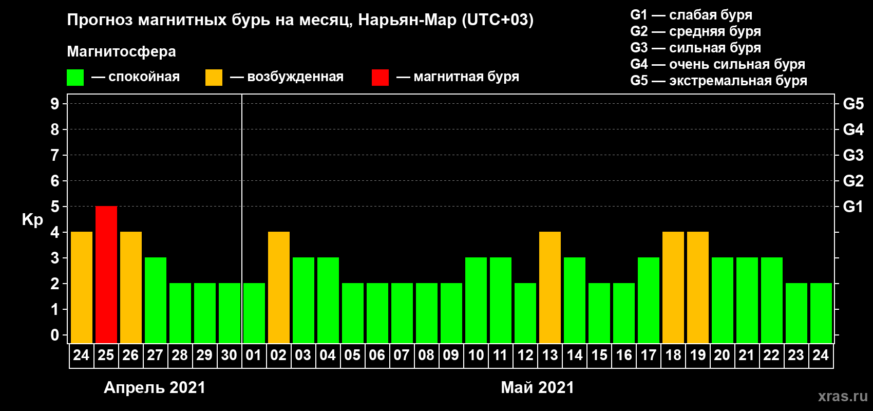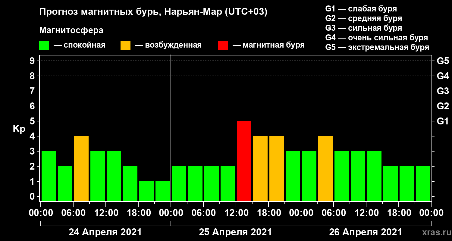 Прогноз магнитных бурь в Нарьян-Маре на 24 апреля 2021 года