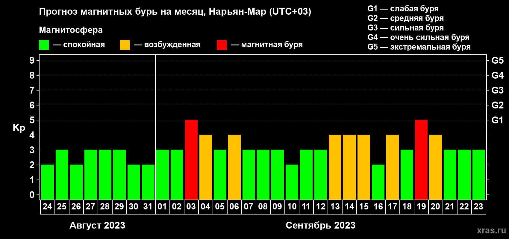 Прогноз магнитных бурь в Нарьян-Маре на 24 августа 2023 года