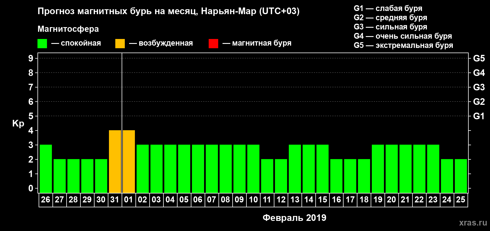Прогноз магнитных бурь в Нарьян-Маре на 26 января 2019 года
