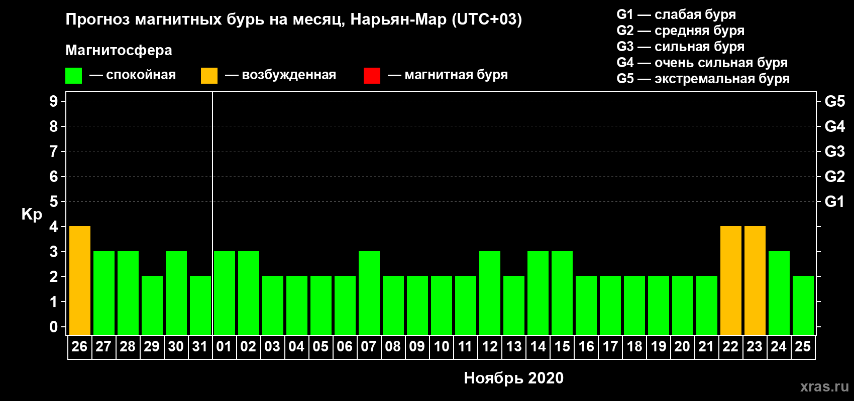 Прогноз магнитных бурь в Нарьян-Маре на 26 октября 2020 года