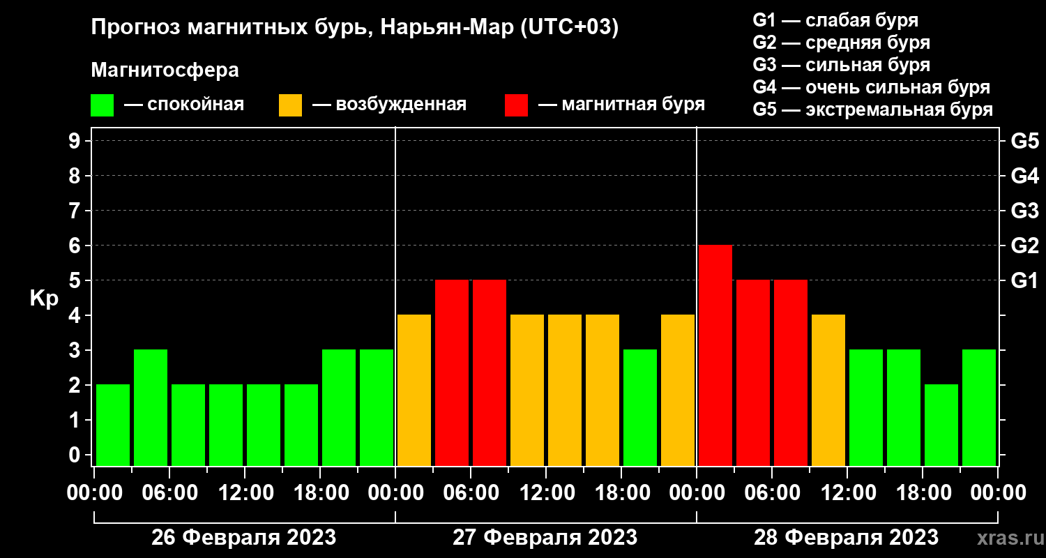 Прогноз магнитных бурь в Нарьян-Маре на 26 февраля 2023 года