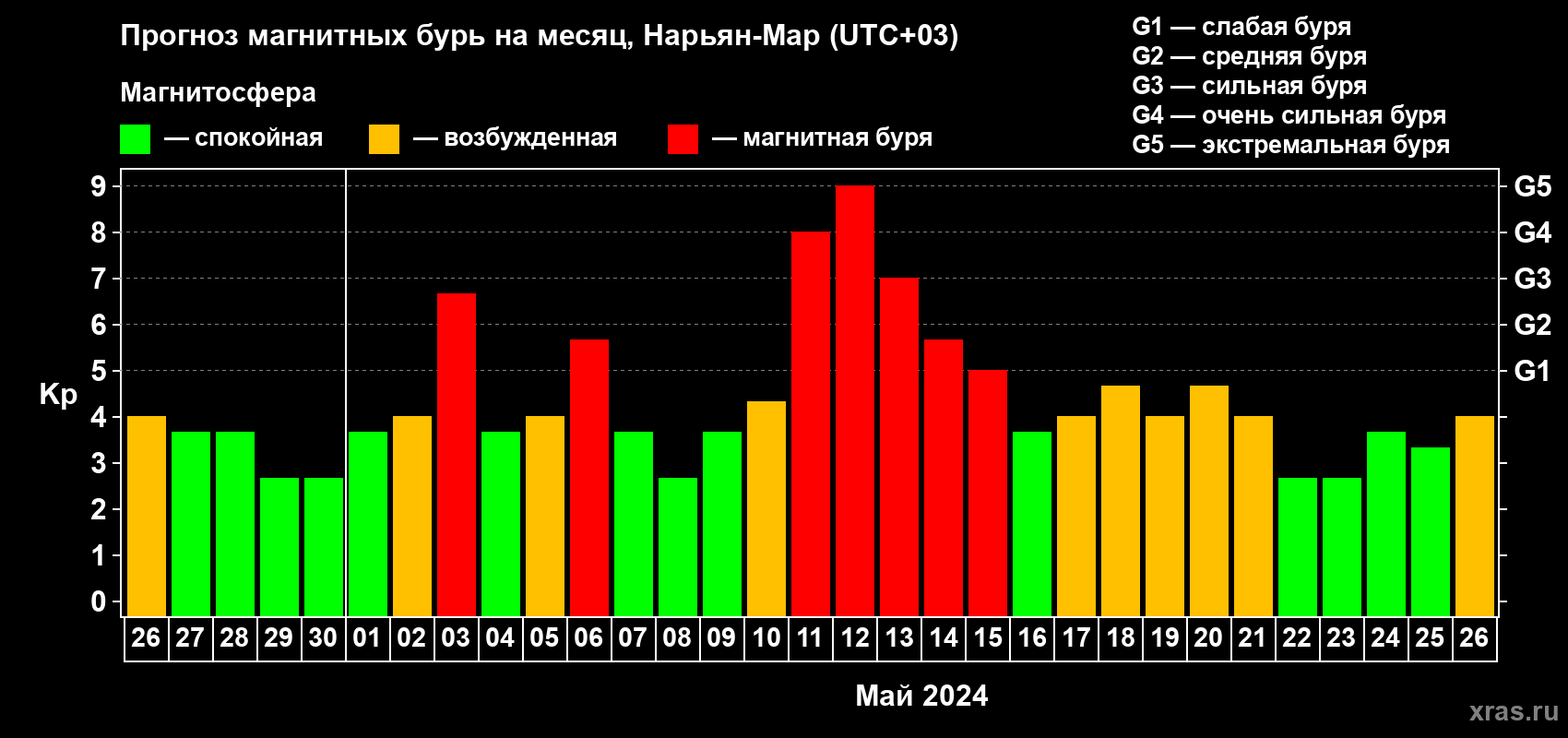 Прогноз магнитных бурь в Нарьян-Маре на 26 апреля 2024 года