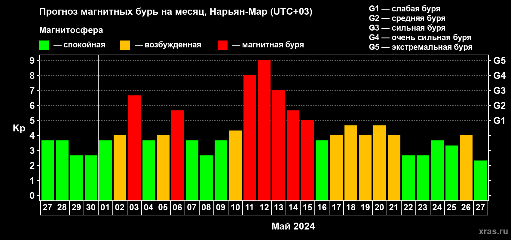 Прогноз магнитных бурь в Нарьян-Маре на 27 апреля 2024 года
