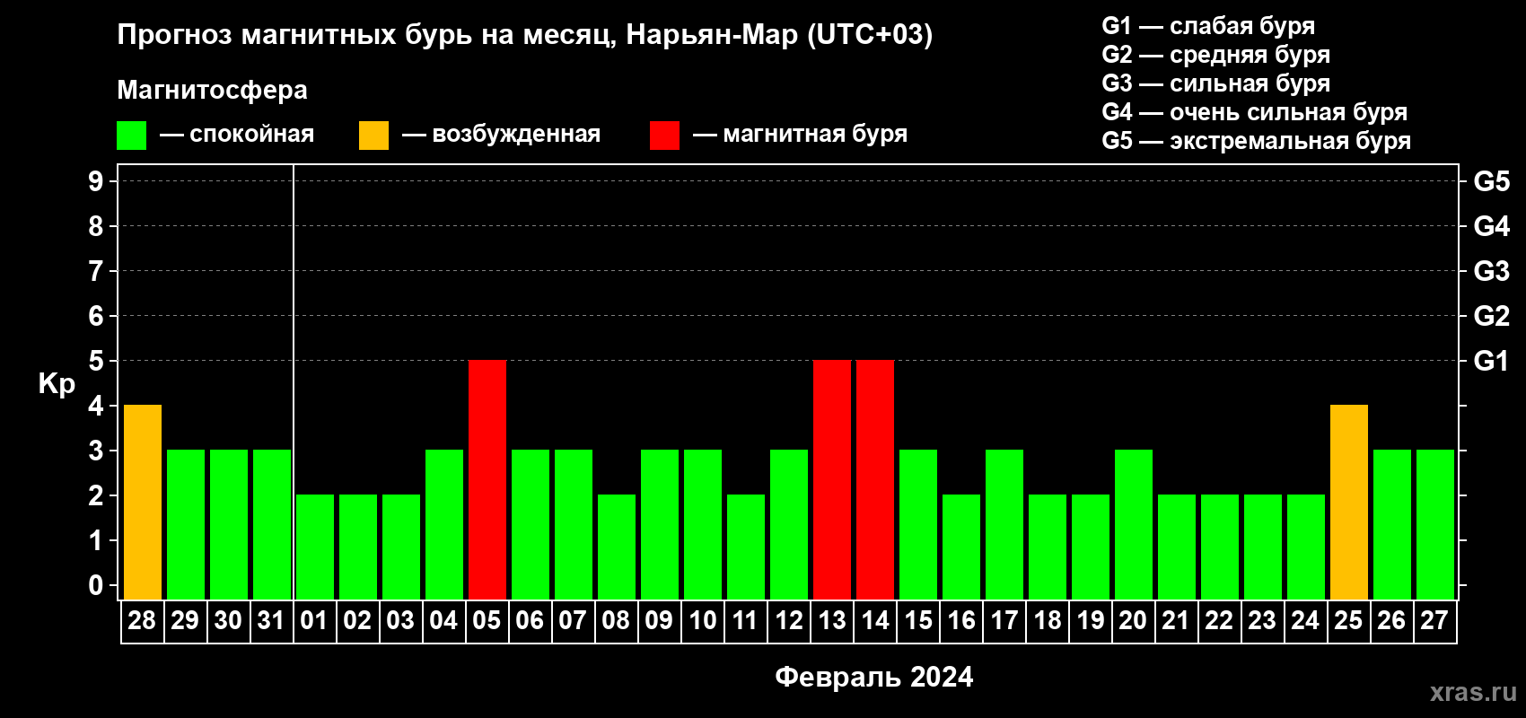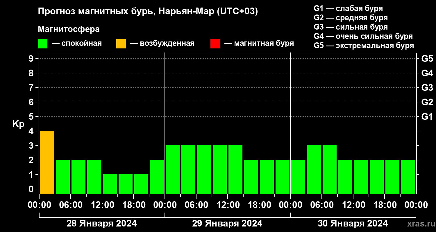Прогноз магнитных бурь в Нарьян-Маре на 28 января 2024 года