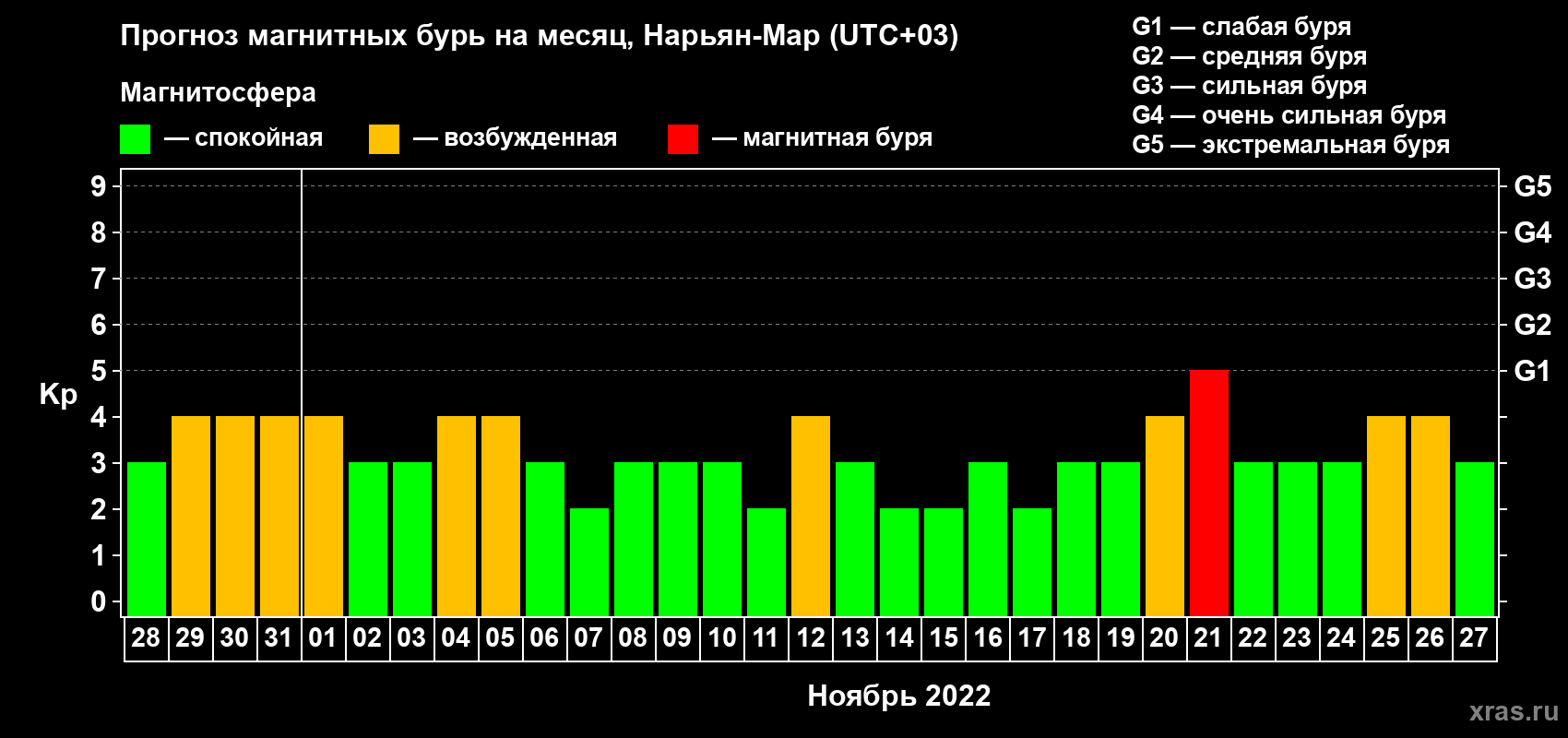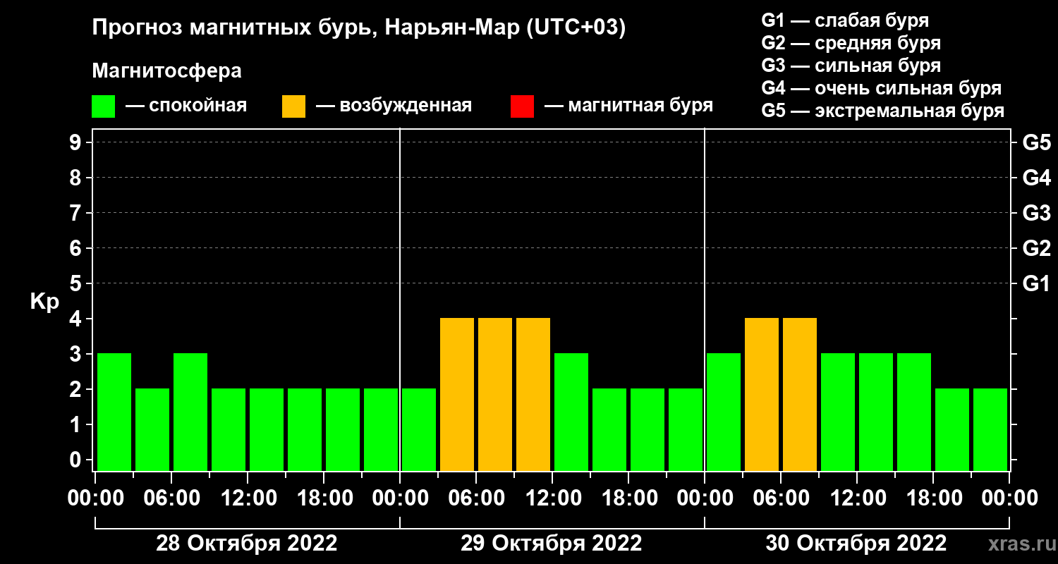 Прогноз магнитных бурь в Нарьян-Маре на 28 октября 2022 года