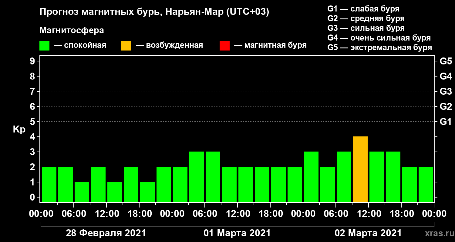 Прогноз магнитных бурь в Нарьян-Маре на 28 февраля 2021 года
