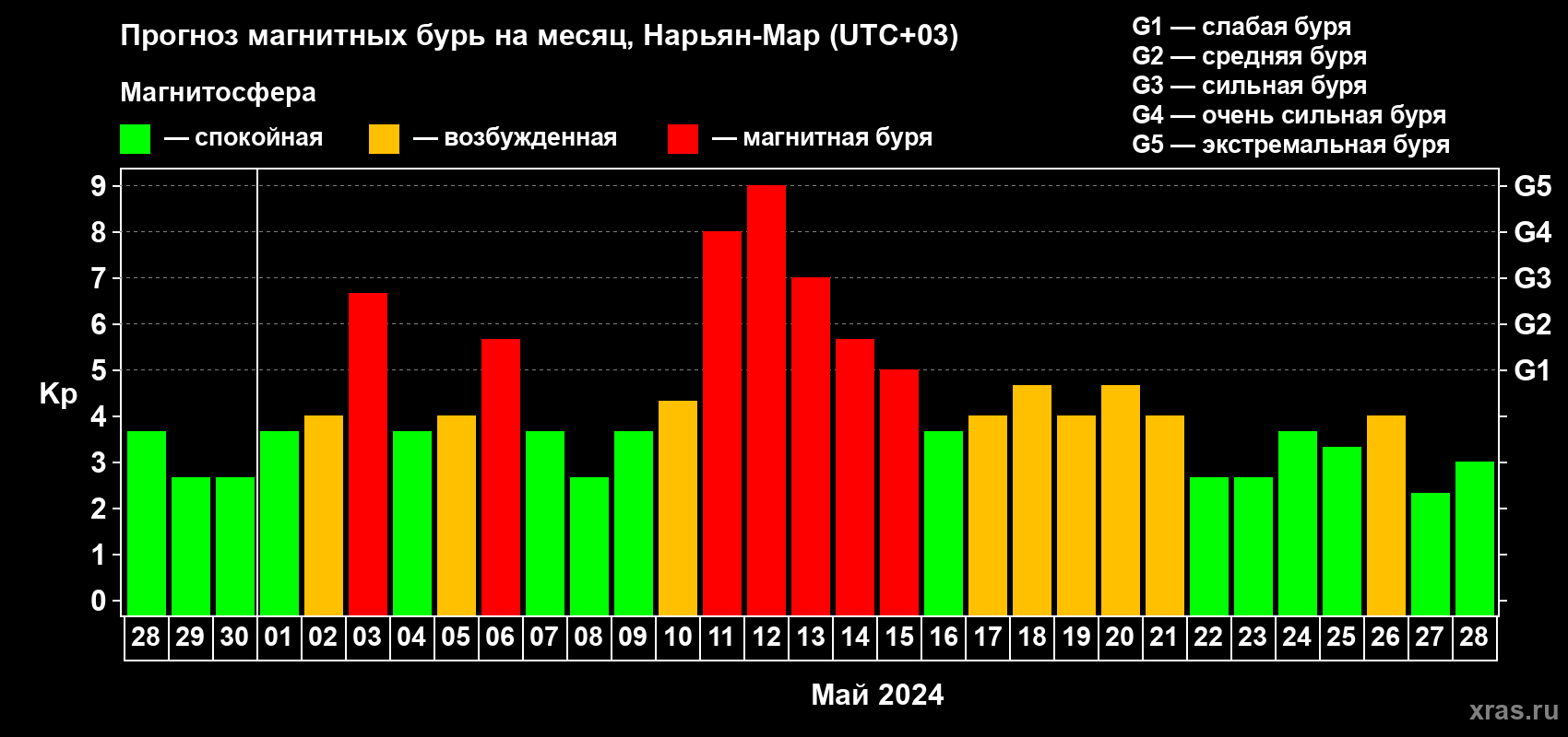 Прогноз магнитных бурь в Нарьян-Маре на 28 апреля 2024 года
