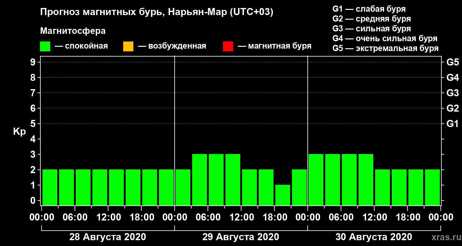 Прогноз магнитных бурь в Нарьян-Маре на 28 августа 2020 года