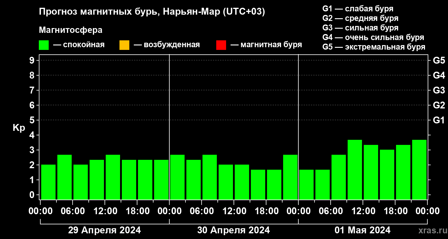 Прогноз магнитных бурь в Нарьян-Маре на 29 апреля 2024 года
