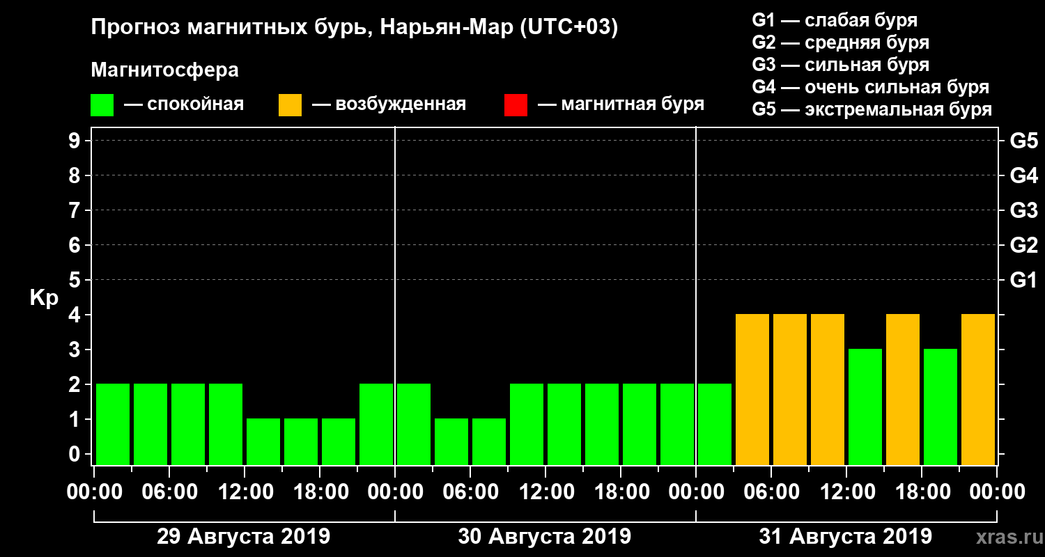 Прогноз магнитных бурь в Нарьян-Маре на 29 августа 2019 года