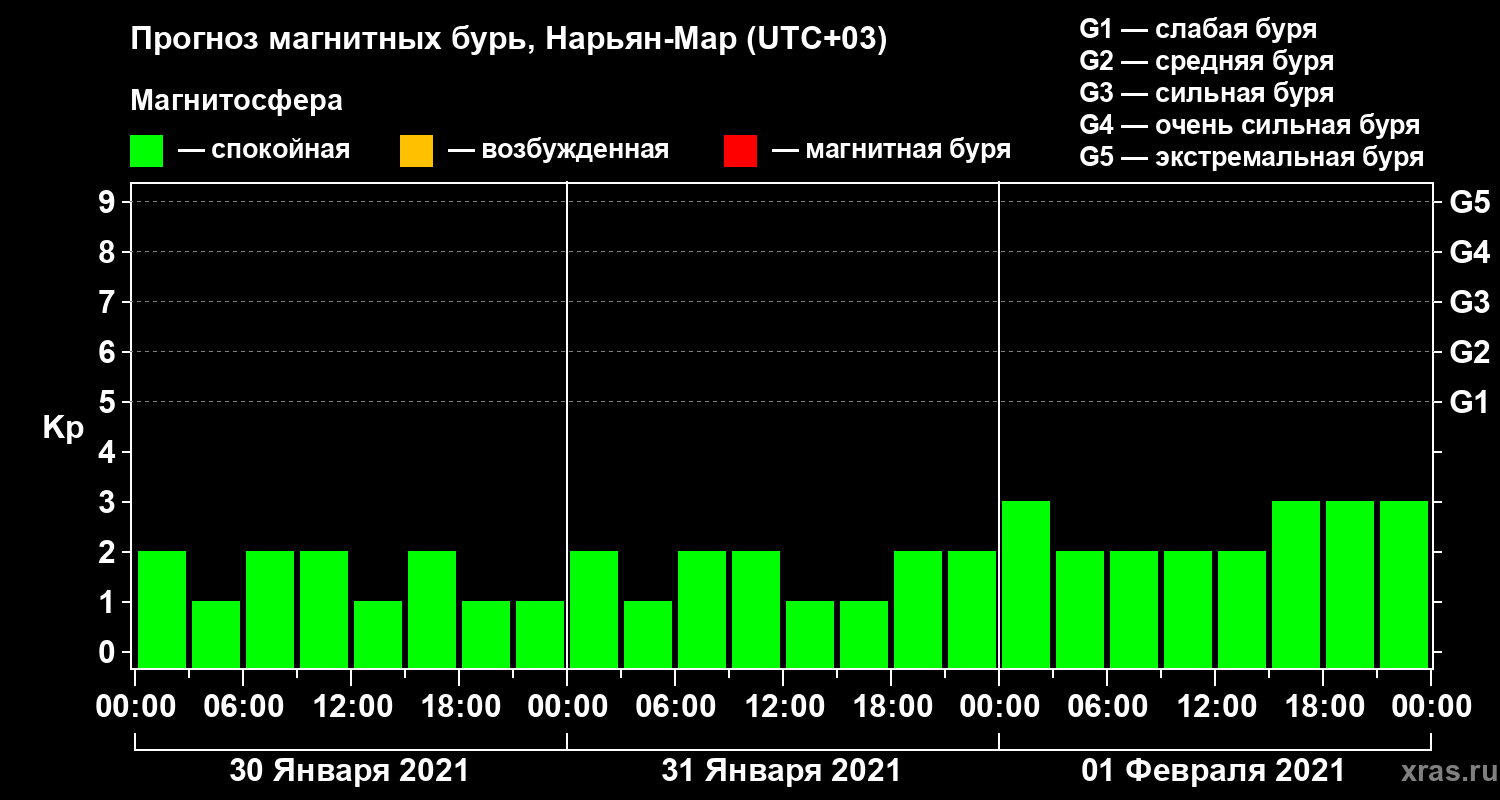 Прогноз магнитных бурь в Нарьян-Маре на 30 января 2021 года