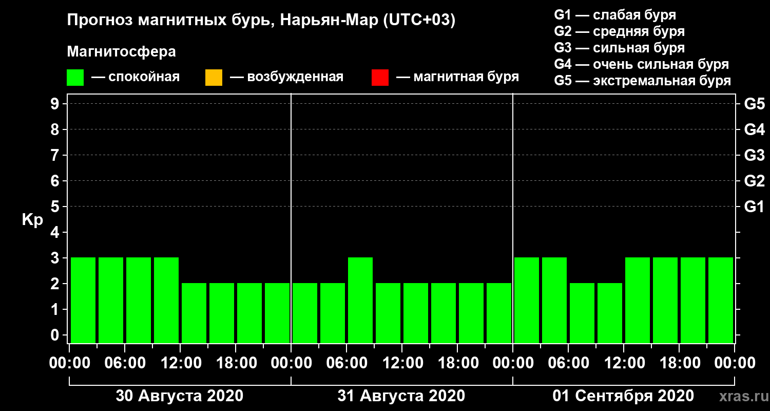 Прогноз магнитных бурь в Нарьян-Маре на 30 августа 2020 года