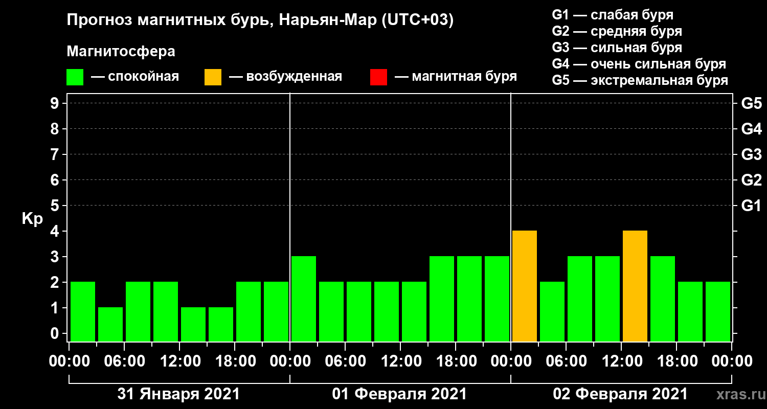 Прогноз магнитных бурь в Нарьян-Маре на 31 января 2021 года
