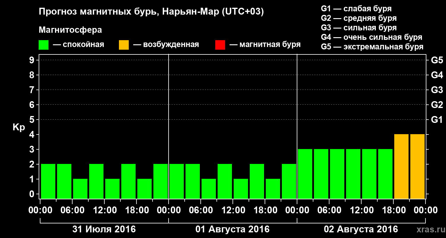 Прогноз магнитных бурь в Нарьян-Маре на 31 июля 2016 года