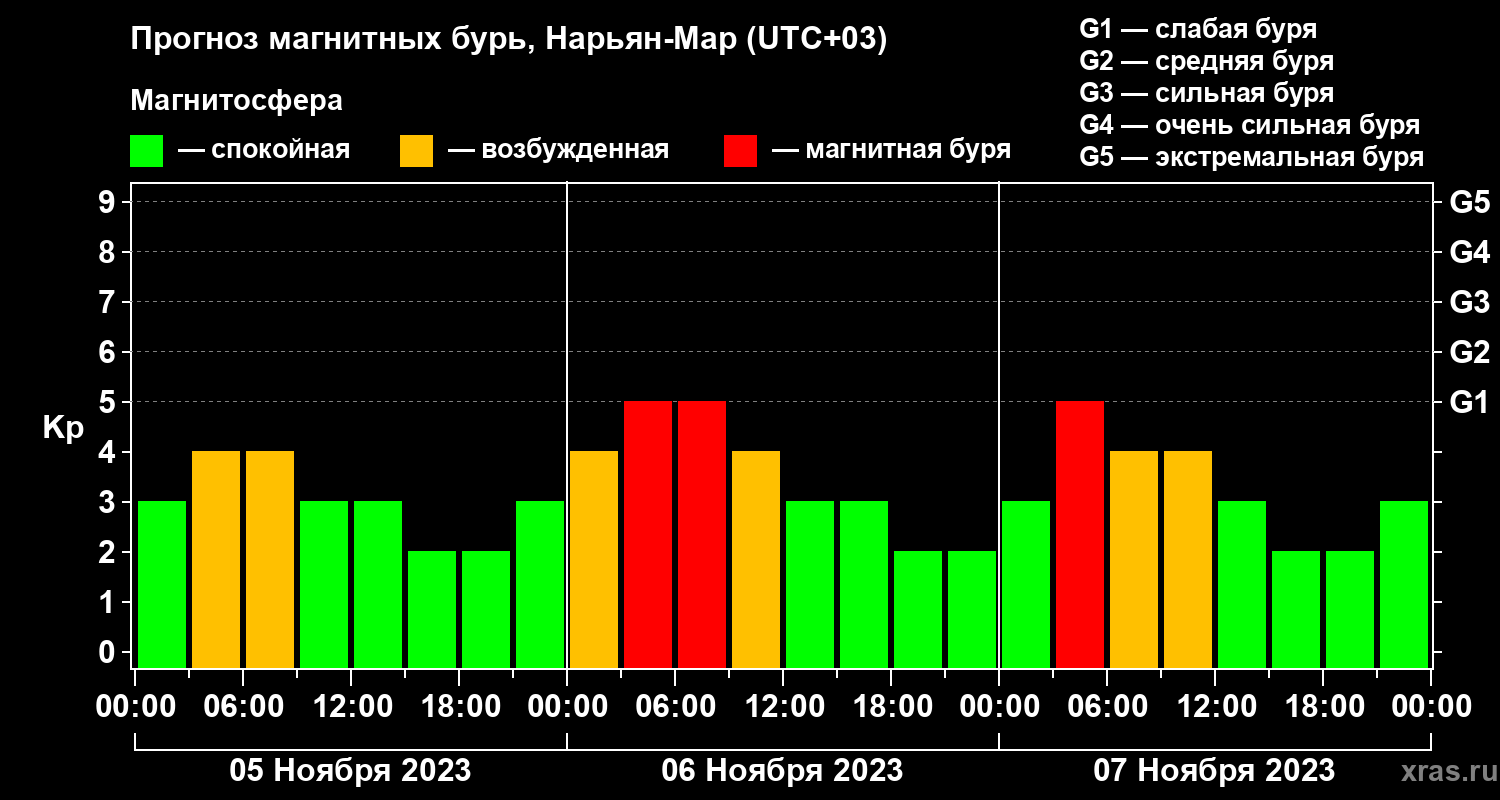 Прогноз магнитных бурь в Нарьян-Маре на 5 ноября 2023 года