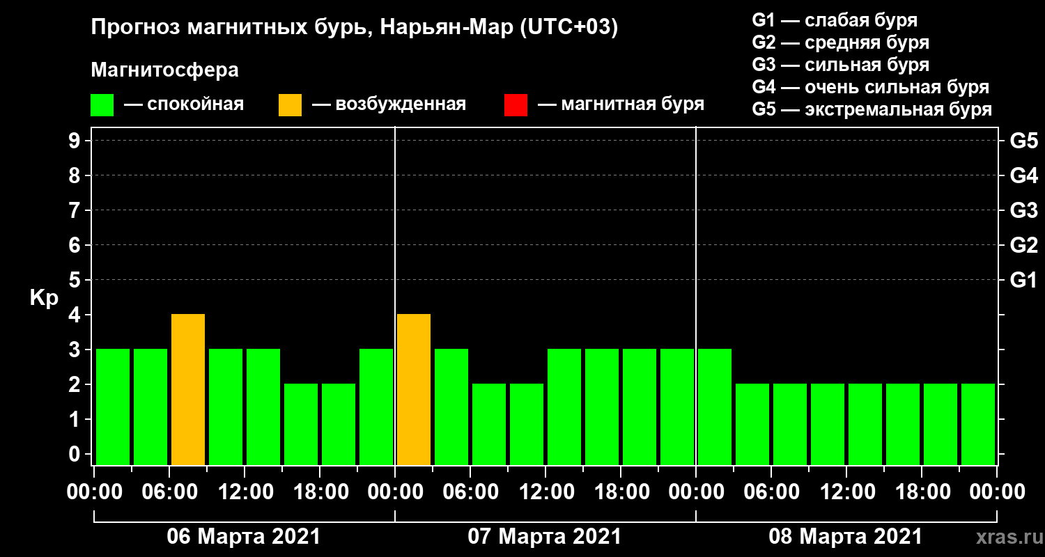Прогноз магнитных бурь в Нарьян-Маре на 6 марта 2021 года