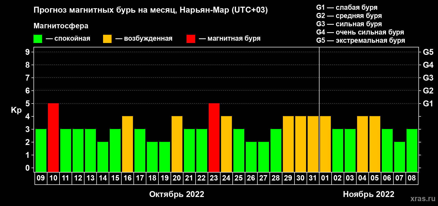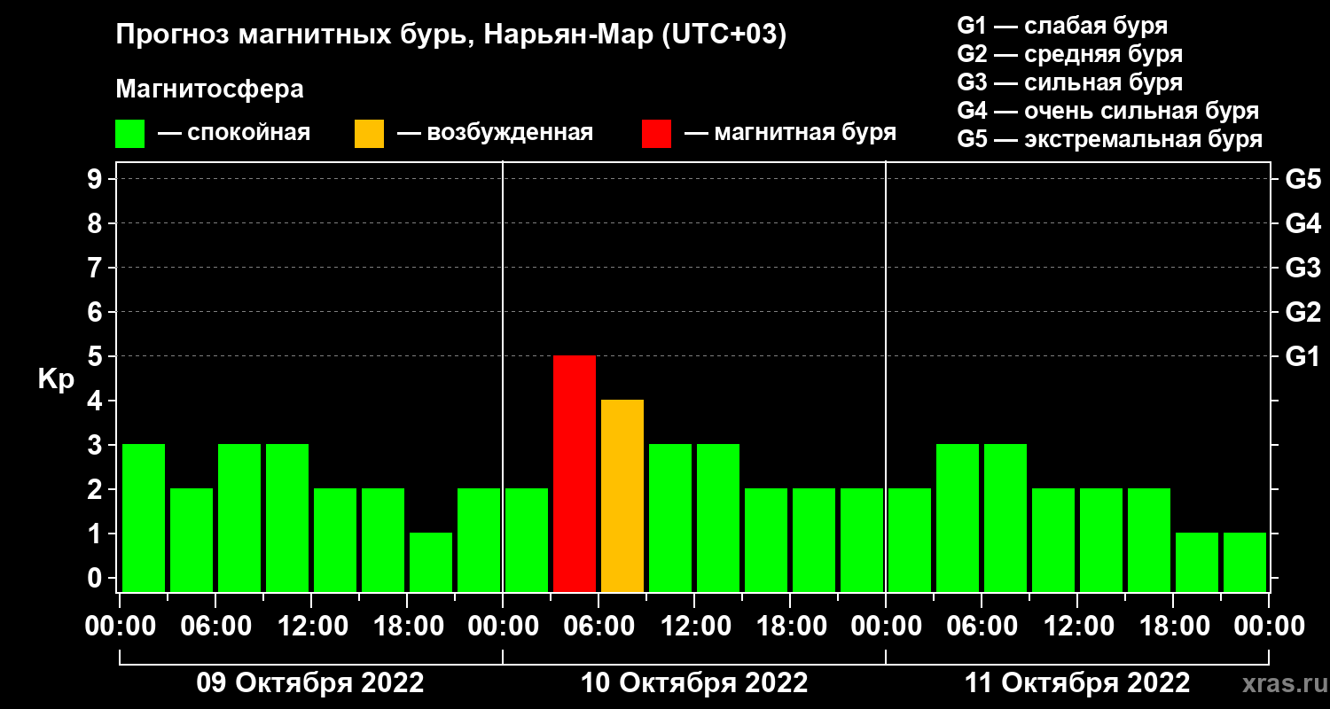 Прогноз магнитных бурь в Нарьян-Маре на 9 октября 2022 года