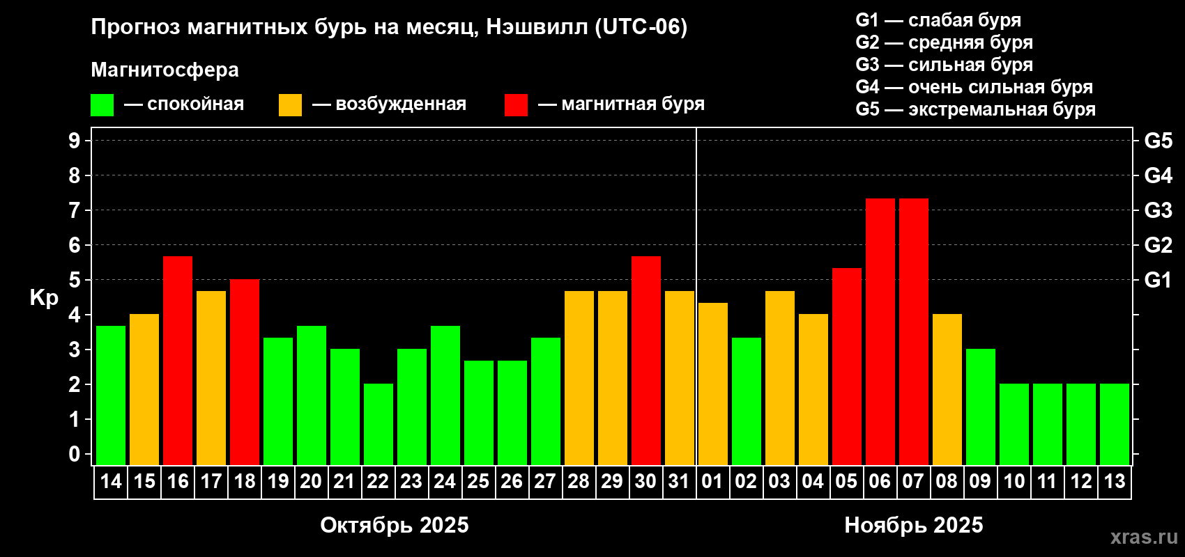 Прогноз магнитных бурь в Нэшвилле — 14 октября 2025 года