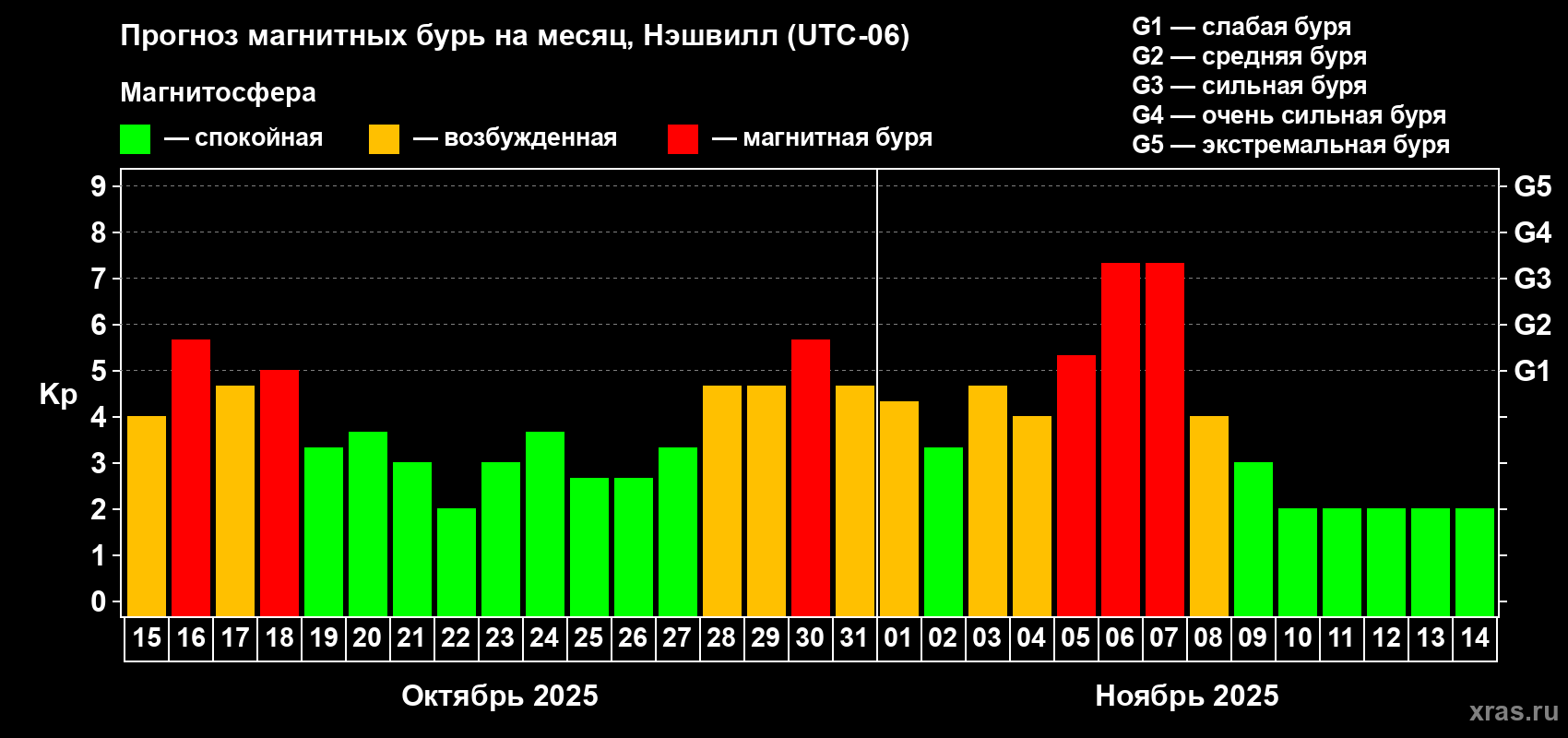 Прогноз магнитных бурь в Нэшвилле на 15 октября 2025 года