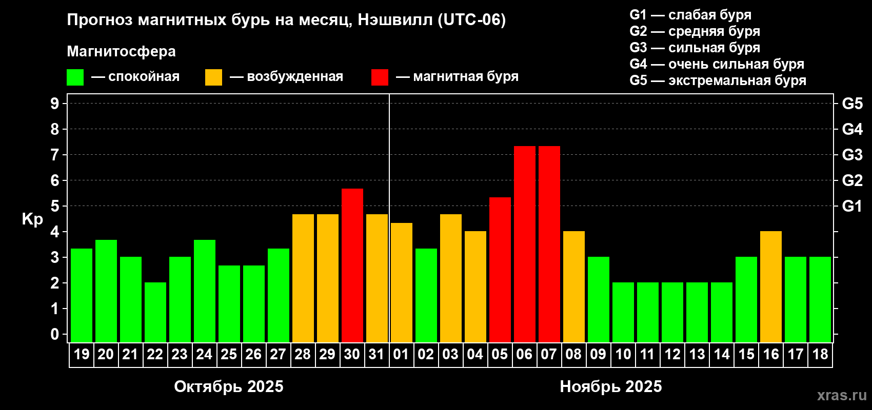 Прогноз магнитных бурь в Нэшвилле на 19 октября 2025 года