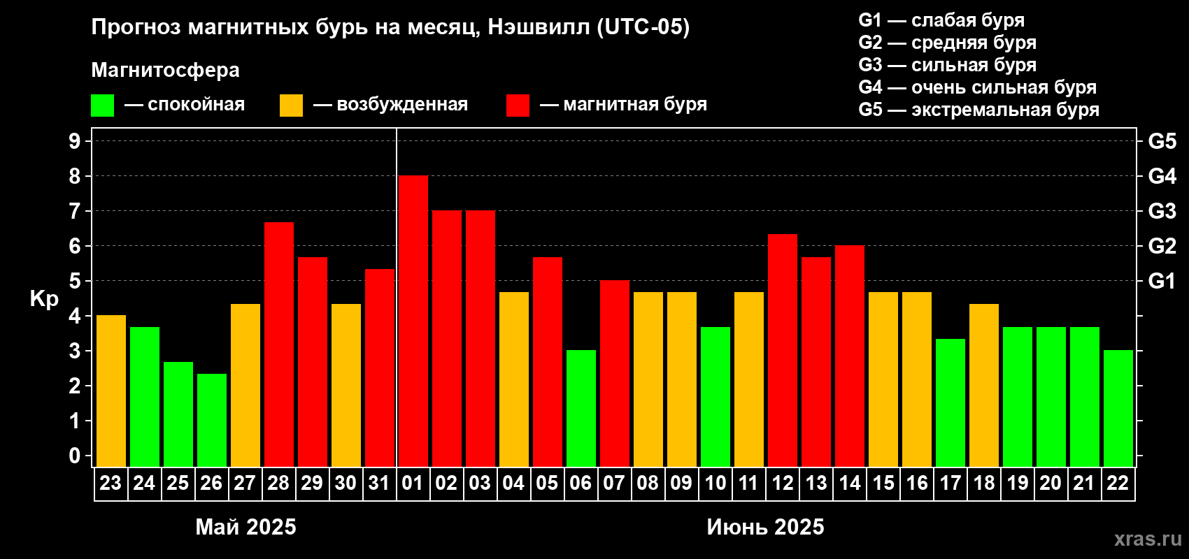 Прогноз магнитных бурь в Нэшвилле — 23 мая 2025 года
